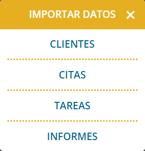Seleccione Clientes, Citas, Tareas o Informes para iniciar el proceso de importación de los datos correspondientes. Continúe con la importación de clientes (ver Iniciar importación de clientes) y/o hacerlo con las citas (ver Importar citas).