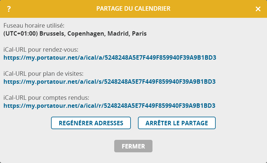 Le partage du calendrier est un flux iCal sous forme d'adresse Internet que vous pouvez ajouter comme calendrier Internet à d'autres programmes. Seuls les personnes qui ont cette adresse Internet peuvent voir votre calendrier. Tant que vous ne mettez pas cette adresse à la disposition d'autres personnes, votre calendrier reste privé. Vous pouvez regénérer les adresses ou arrêter le partage du calendrier à tout moment.
