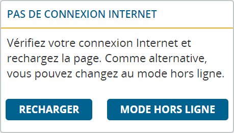 Cliquez sur Recharger si vous avez restauré la connexion Internet et vous voulez essayer de vous connecter. Si une connexion Internet n'est pas possible, cliquez sur Mode hors ligne. Le mode hors-ligne affiche le plan de visites qui a été téléchargé en dernier.