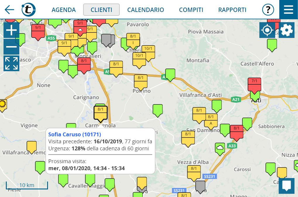I simboli indicano i tuoi clienti, il colore invece indica di default l'urgenza di visita (rosso = in ritardo, giallo = urgente, verde = non urgente, grigio = nessuna cadenza di visita o data di attivazione nel futuro). È possibile anche impostare i criteri di colorazione in base alle proprie esigenze (vedi Opzioni della mappa dei clienti).