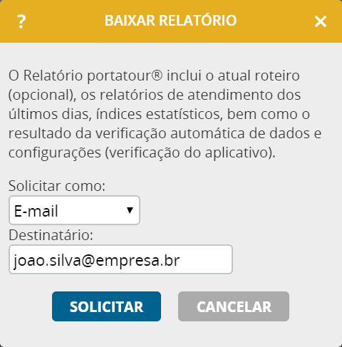 Mediante solicitação, o portatour® apresenta o roteiro de atendimento atual, juntamente com um resumo dos relatórios de atendimento e uma referência estatística de dados relevantes sobre atendimento de clientes na sua área de atendimento em forma de relatório enviado por e-mail ou exibido no website. Detalhes sobre o conteúdo e estrutura estão disponíveis no item Descrição do conteúdo e Verificação do aplicativo.